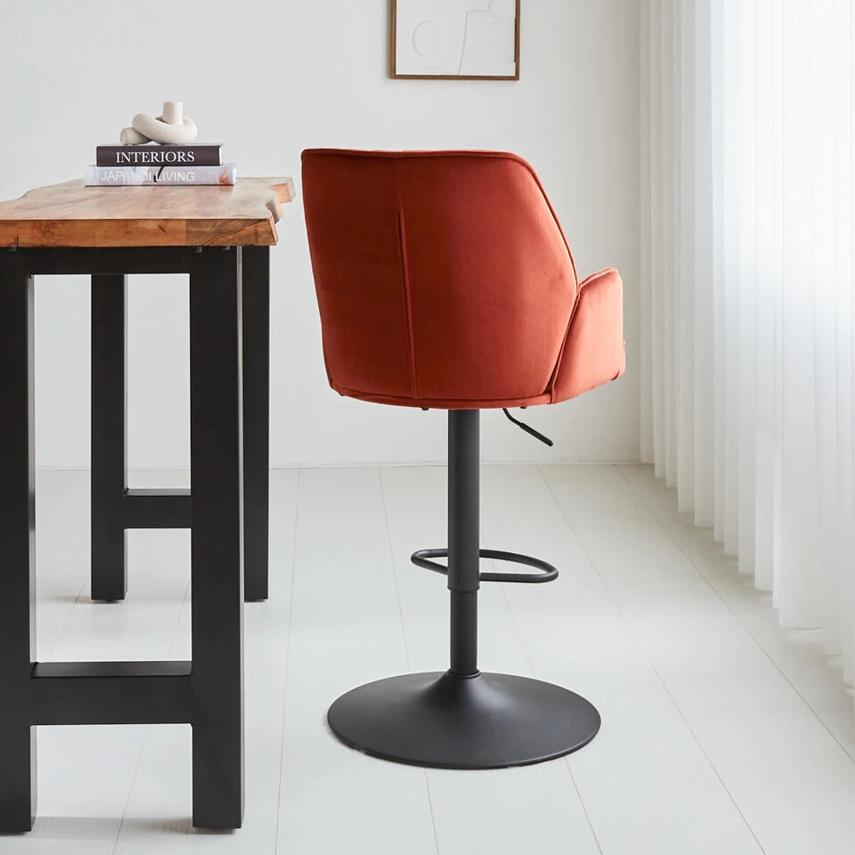 Barkruk Novan is een stijlvolle barkruk gemaakt van velvet en is één van onze meest comfortabele barkrukken. De barkruk bevat een mooi design met stiknaden en een hoog zitcomfort dankzij de armleuningen en rugleuning. Andere voordelen van barkruk Novan zijn dat deze 360 graden draaibaar is en in hoogte verstelbaar is. Deze barkruk is onderdeel van de Novan-serie welke goed gecombineerd kan worden met andere meubels uit deze serie.Â