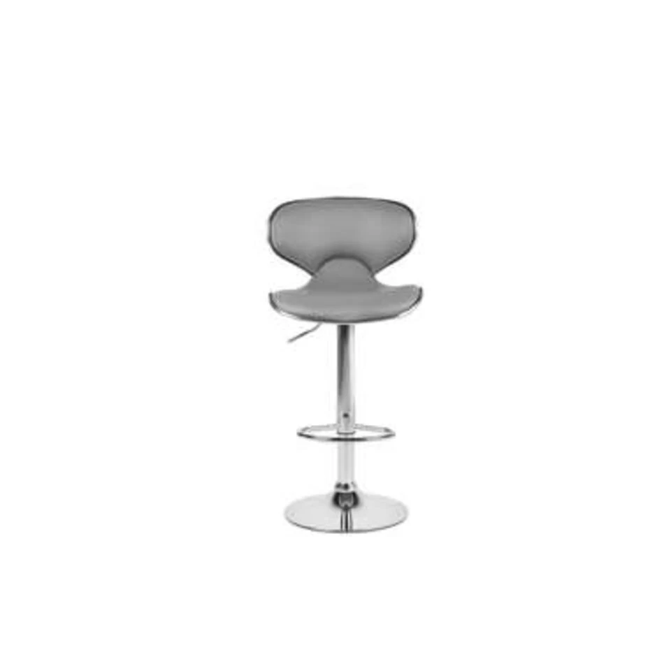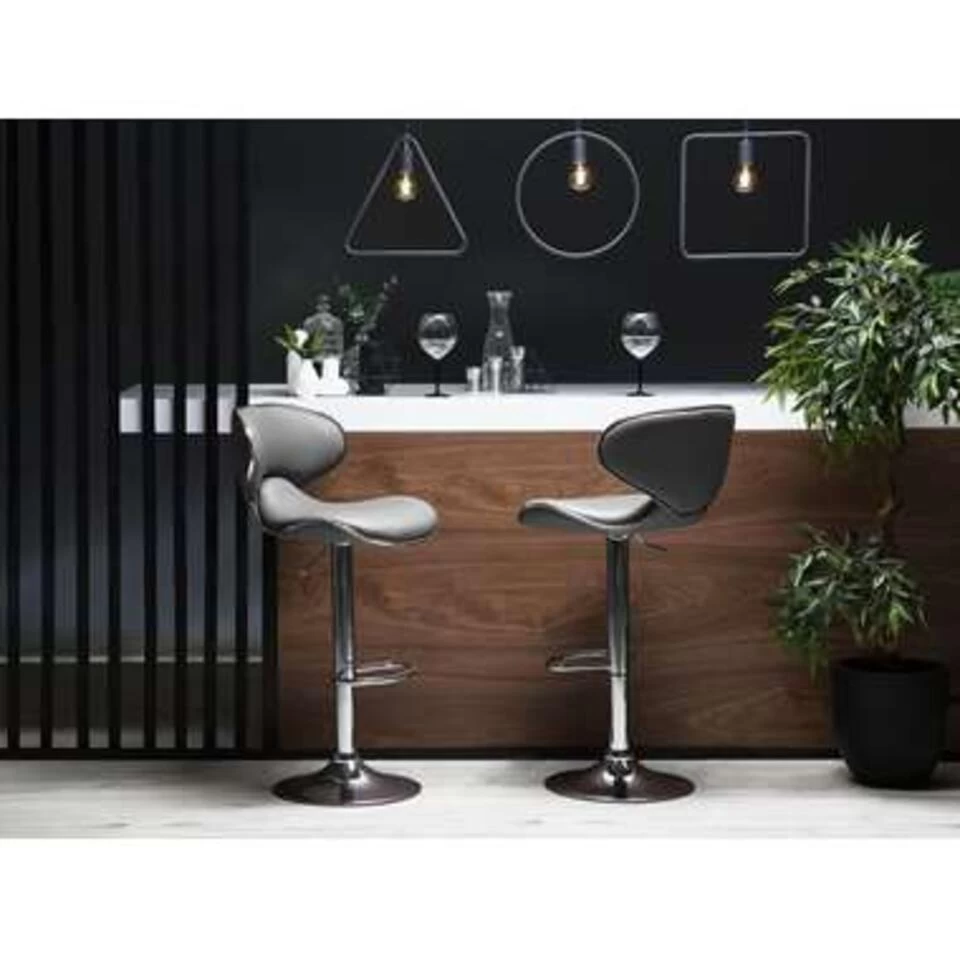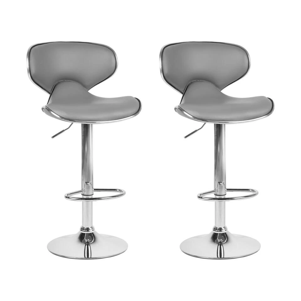 Set van 2 verstelbare krukken in grijs. Verrijk je keukeneiland of de eetkamer met deze moderne meubelstukken. De in hoogte verstelbare en draaibare barkrukken hebben een aangename bekleding van kunstleer en een massief metalen onderstel. De elegante kleur in combinatie met de glanzende zilveren voet geeft het een nobele uitstraling, die jouw huis een glamoureuze touch geeft.