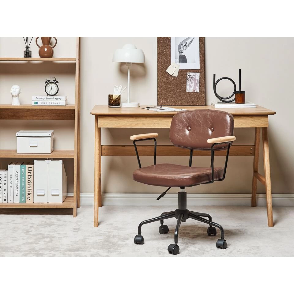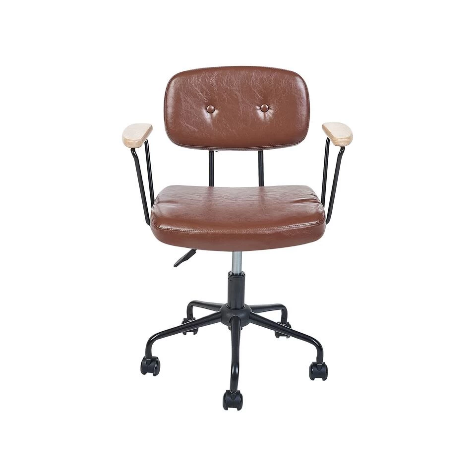 Verstelbare bureaustoel. Deze retro-geïnspireerde stoel met een modern tintje kan een mooie toevoeging zijn aan elk thuiskantoor. Kunstleren bekleding met een glanzende afwerking voegt elegantie toe aan het stuk, waardoor het niet alleen functioneel, maar ook stijlvol is. Plywood armleuningen passen perfect bij de zwart metalen constructie. De ingebouwde gasveer maakt het mogelijk om de stoel te verstellen, zodat deze perfect aansluit bij je wensen.