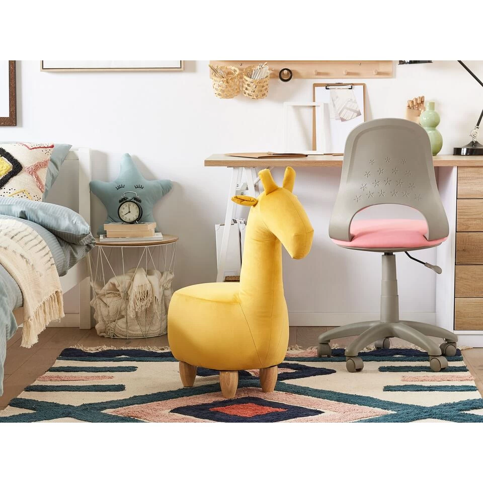 Modernw hocker in de vorm an een giraffe. Maak van de kamer van je kind een charmante en uitnodigende ruimte dankzij deze prachtige poef in de vorm van een giraf. De levendige gele kleur van de zacht aanvoelende fluwelen bekleding past goed bij veel tinten en stijlen, waardoor het een perfecte aanvulling is op elke ruimte. Bovendien wordt de stabiele constructie van de kruk ondersteund door stevige massief houten poten. De poef kan ook gebruikt worden als voetenbankje of speelgoed, want zijn buitengewone vorm zal zeker tot de verbeelding van je kind spreken.
