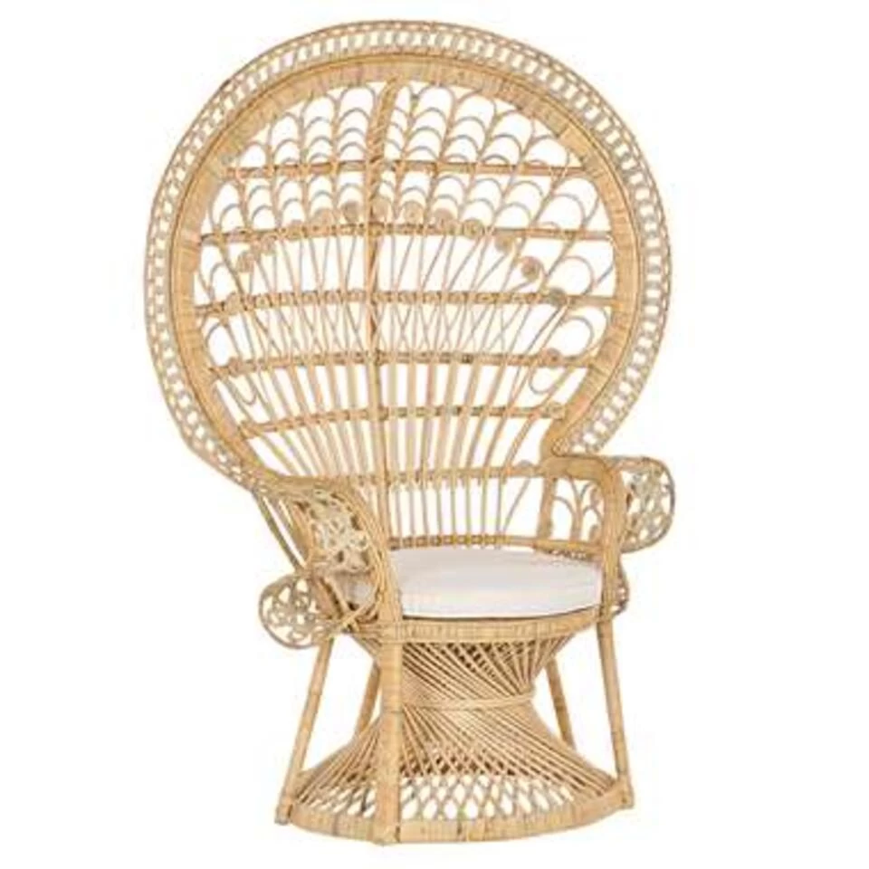 Volumineuze pauwenstoel van natuurlijk rotan. Het meest onderscheidende meubelstuk uit de jaren 60 en 70 is terug en is nog steeds stijlvol. De romantische en speelse waaiervormige rugleuning, doet denken aan een wijd open verenstaart van een pauw, is een ultieme blikvanger en geeft de fauteuil een majestueus en dromerig karakter. Dankzij de prachtig geweven rotan details wordt de stoel het middelpunt van elke boho ingerichte woonkamer.