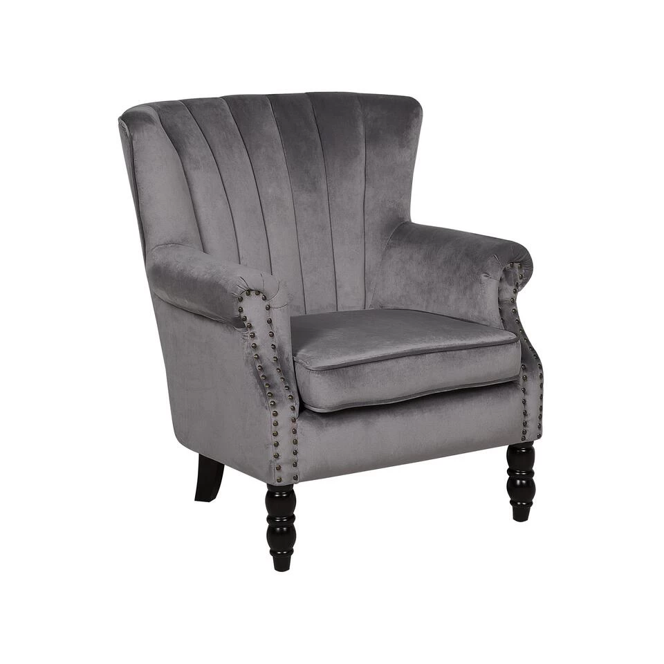 Grijs gestoffeerde fauteuil. Leun achterover en geniet van het moment in onze feel-good stoel. De twee voorste poten van rubberhout harmoniëren met de fluwelen zachte bekleding in grijs. Het hoogtepunt – de subtiele knopversiering op de armleuningen.