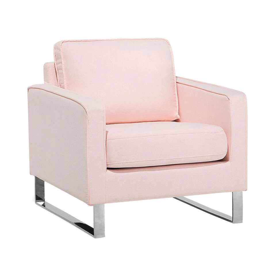 Comfortabele gestoffeerde fauteuil in roze. Dankzij de hoogwaardige afwerking krijgt deze comfortabele stoel een stijlvolle uitstraling die opvalt. Het aangename polyester materiaal zorgt voor een mooie bekleding, de armleuningen zorgen voor comfort. De metalen voet is stevig en stabiel.