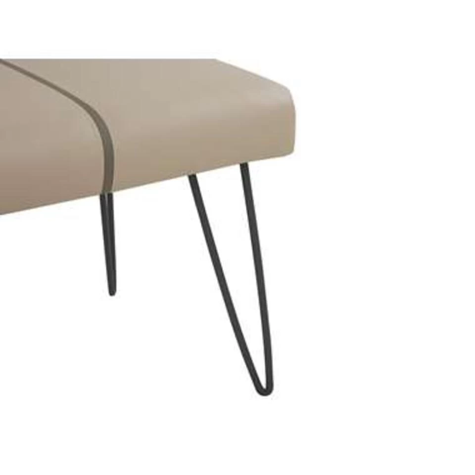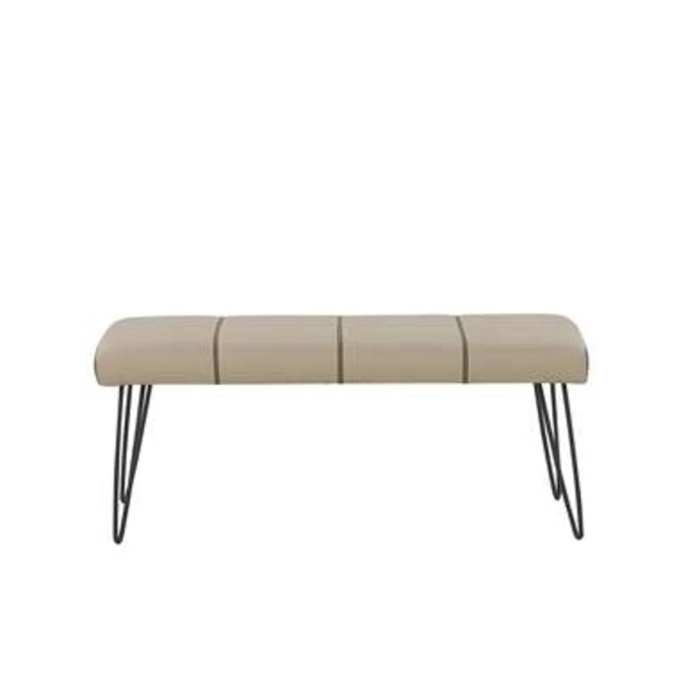 Stijlvolle bank van kunstleer in beige met metalen poten . Een stijlvolle gestoffeerde bank die je woon- of slaapkamer opleukt. Het model is gemaakt van hoogwaardig, synthetisch leer met verticale quilts, wat het buitengewone design van de bank benadrukt. Gebruik het als comfortabele voetensteun, extra zitplaats voor gasten, praktische opbergruimte voor je tablet of boek of als poef naast de bank of bed.