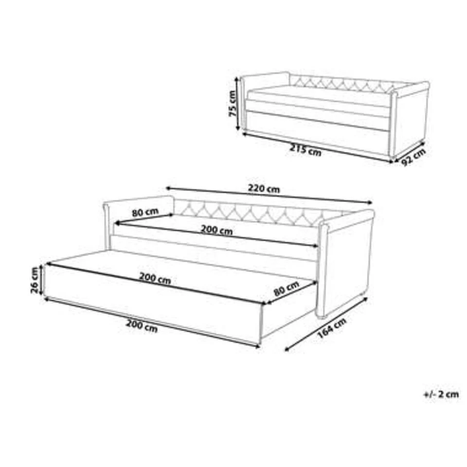 Elegant tandembed met lichtgrijze bekleding in linnenlook. Dit onderschuifbed, geïnspireerd op de vormen van Chesterfield, combineert zowel functionaliteit als stijl. Het bed is op maat gemaakt met zacht aanvoelende linnen polyester bekleding en heeft decoratieve knopen in vintage-stijl die naadloos passen bij interieurs in retro en traditionele decors. De duurzame lattenbodem zorgt voor een gelijkmatige verdeling van het lichaamsgewicht voor een gezonde en ongestoorde slaap. Het bed kan met een enkele trek een extra slaapoppervlak bieden, wat handig is bij het hosten van een logeerpartij.