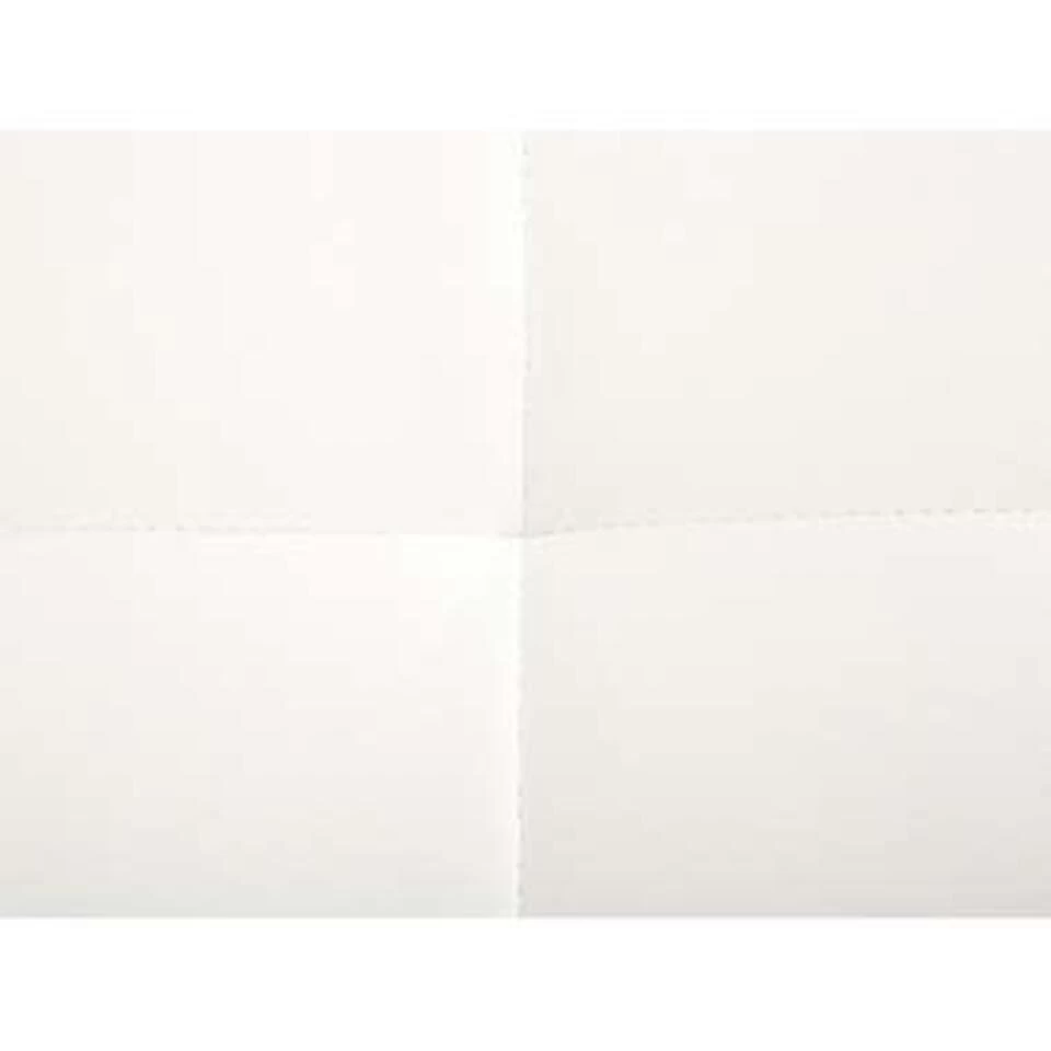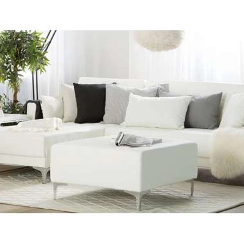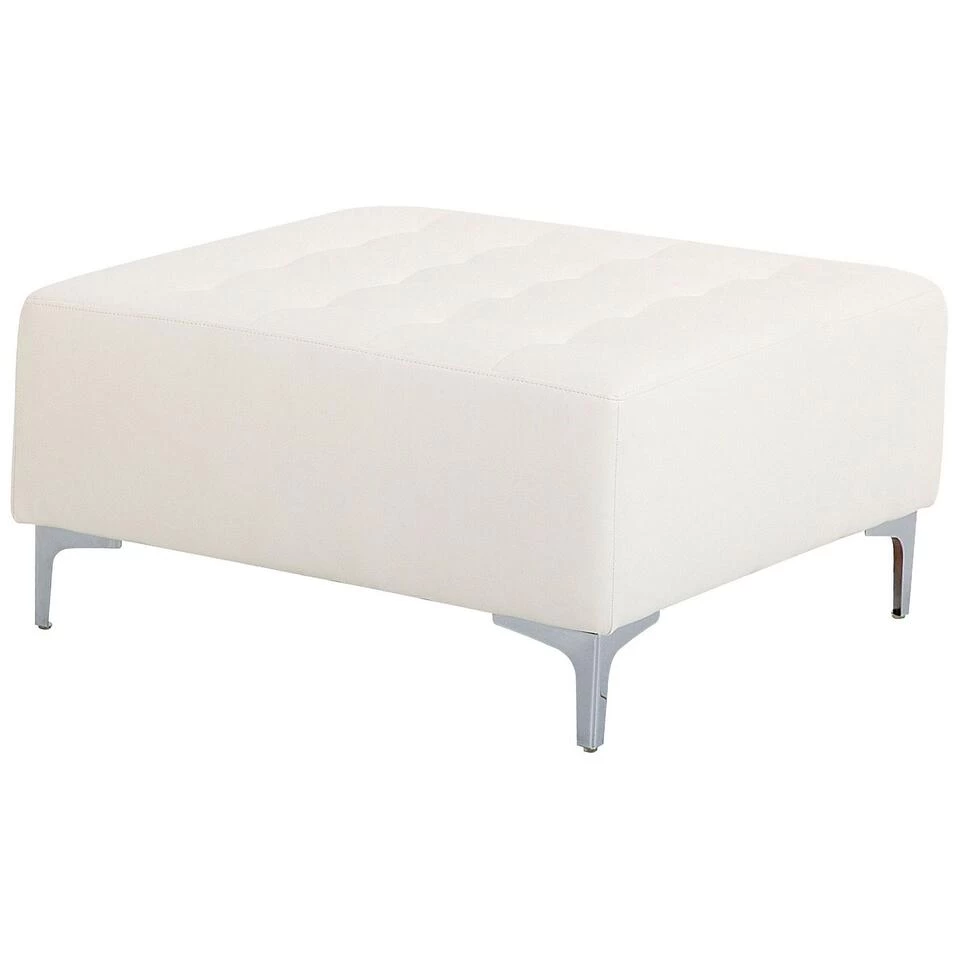 Moderne ottomaan in wit kunstleer. Deze moderne voetenbank is de perfecte aanvulling op een bankstel. Volledig gestoffeerd met hoogwaardige stof en elegante tufting, past hij bij elk interieur. Combineer het met andere stukken uit de collectie om een zitgroep te creëren die bij je past. Het geheel staat stabiel dankzij de metalen poten.