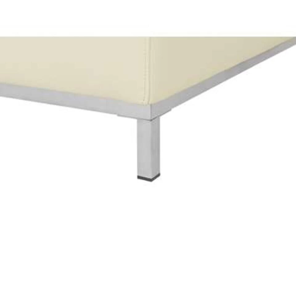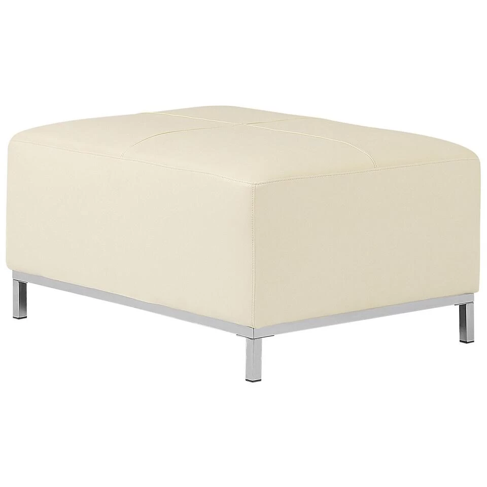 Beige, elegante leren ottomaan. Deze poef is een echt prachtstuk. Je kunt ze in een set kopen met de bank, maar ze zijn vanwege hun populariteit ook afzonderlijk verkrijgbaar. De stevige, duurzame stoffen hoes is zorgvuldig genaaid en strak over de comfortabele voering getrokken. De verchroomde poten geven de ottomaan een modern tintje en vervolledigen het ontwerp.