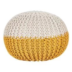 Gehaakte poef met gele accentkleur. Als je op zoek bent naar een vrolijk accent om je interieur op te vrolijken, dan is deze schattige gebreide ronde poef perfect. Met dik weefsel in een warme kleur en stevige, hoogwaardige vulling, kan het dienen als voetenbank, als basis voor een tafeltje of gewoon als decoratief stuk – de mogelijkheden zijn eindeloos. Wees creatief met het mixen van kleuren en maten om een ideale compositie voor je woonruimte te maken en geniet van de charmante moderne sfeer.