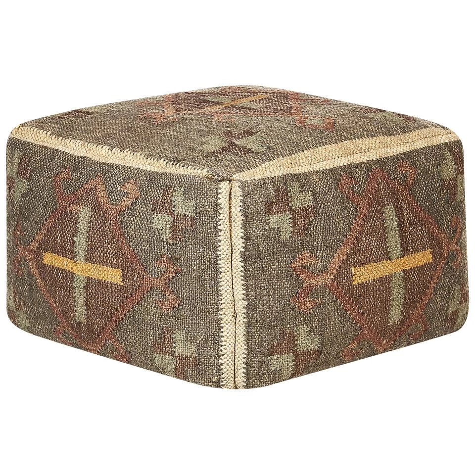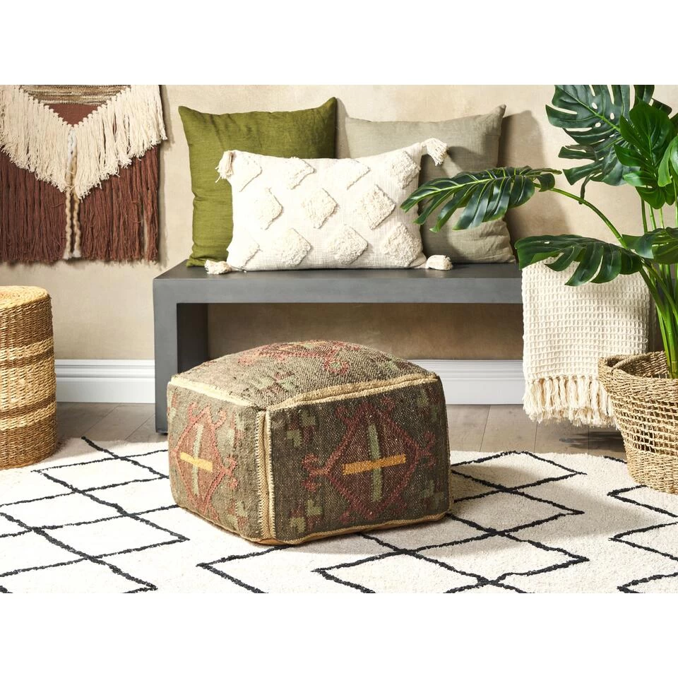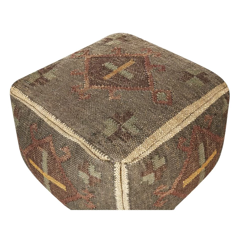 Handgeweven poef in kelimstijl. Deze poef is gemaakt met de traditionele Indiase Panja-weeftechniek en is een opmerkelijk werk van ambachtslieden die met handgereedschap de hoes minutieus weven, waardoor elk stuk uniek is. Met een sterke mix van jute en wol geeft de bekleding vorm aan de vulling van EPS-ballen. Het oosterse patroon in verwassen multi-toned kleurenpalet maakt het een complementair stuk voor interieurs in boho- en vintagestijl. Deze poef is perfect als extra zitplaats of als opvallende voetensteun en biedt zowel stijl als functionaliteit