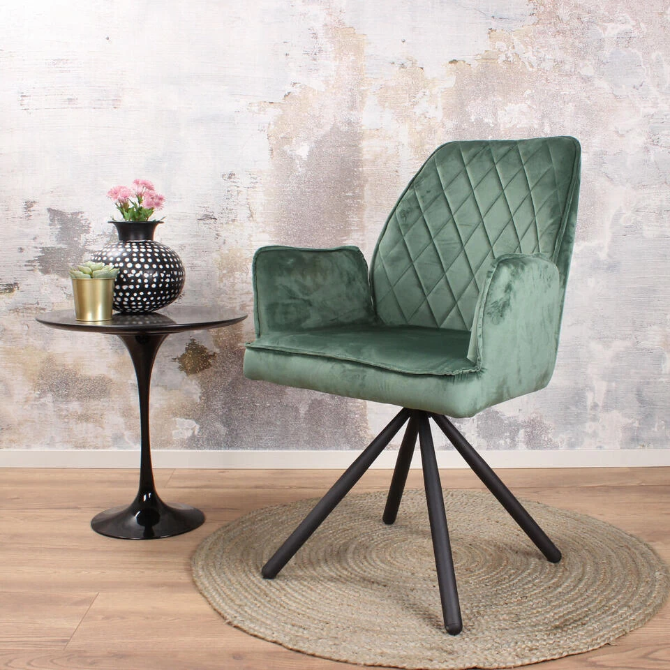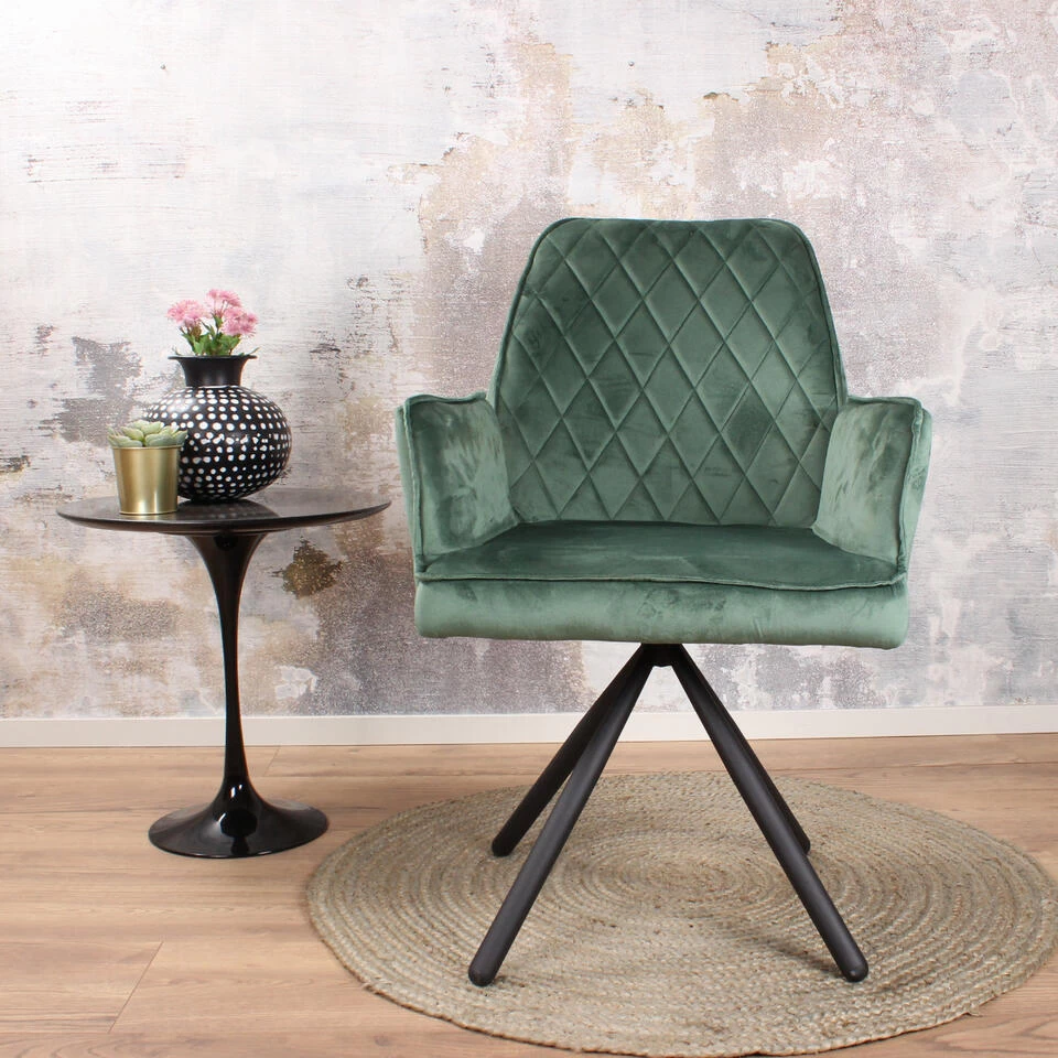Stijlvol, comfortabel en stoer! Dat zijn de kenmerken van de Armstoel Lucio. Het bijzondere van deze eetkamerstoel is dat hij draaibaar is. De zitting van deze stoel is bekleed met sterk en zacht velours. Daarnaast is de rugleuning voorzien van een sierlijk ruitpatroon. Deze stoel staat op een stevig zwart gepoedercoat stalen onderstel in de vorm van een vierpoot. Om deze stoel extra comfort te geven is hij uitgevoerd met armleuningen. Deze stoel komt perfect tot zijn recht in een industrieel, modern, landelijk of vintage interieur. Armstoel Lucio is verkrijgbaar in vijf populaire kleuren: champagne, zwart, goud, roze en groen.