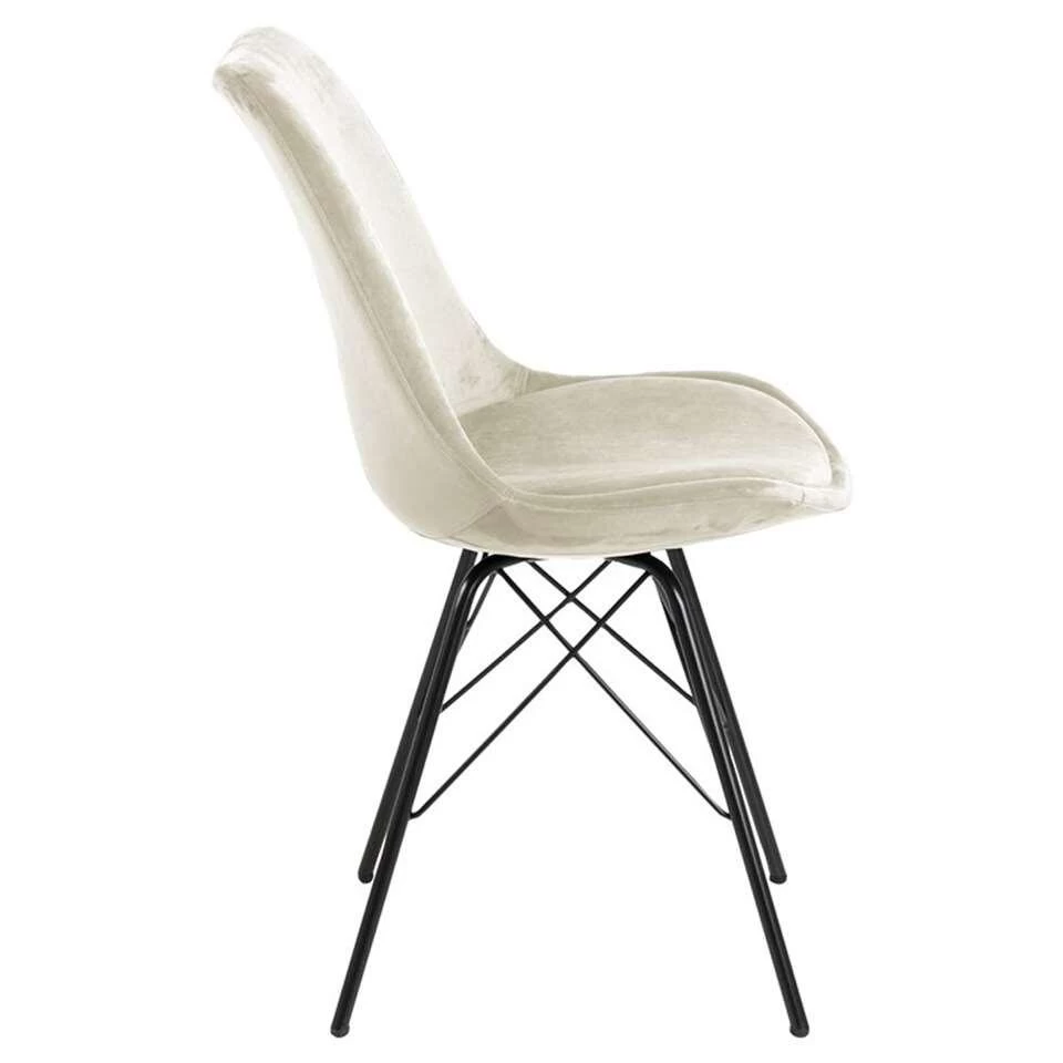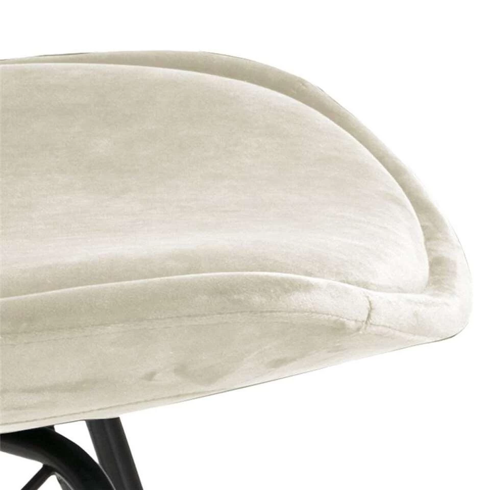 De kuip van de stoel is uitgevoerd in zandkleurige velvet stof, inclusief zacht zitkussentje. De poten van dit kuipstoeltje zijn gemaakt van staal.