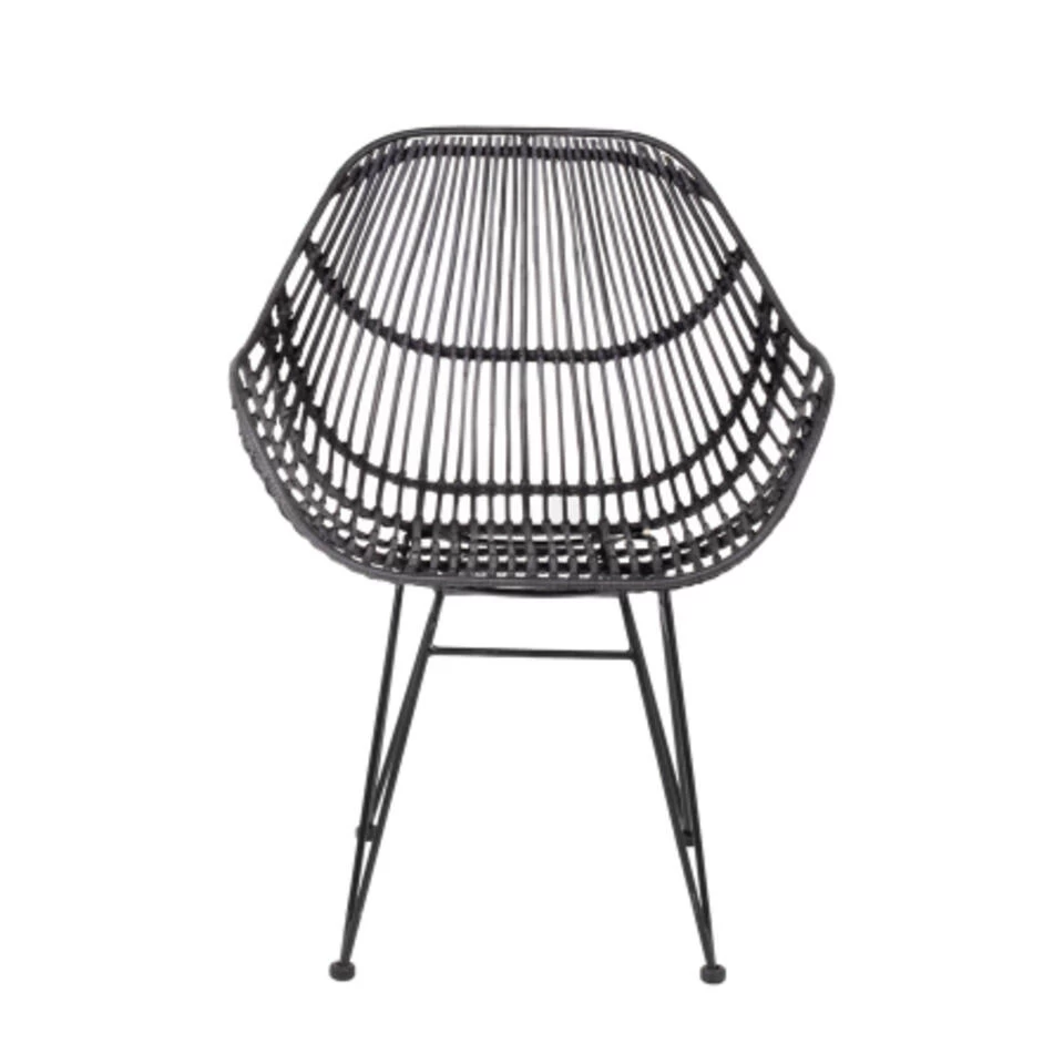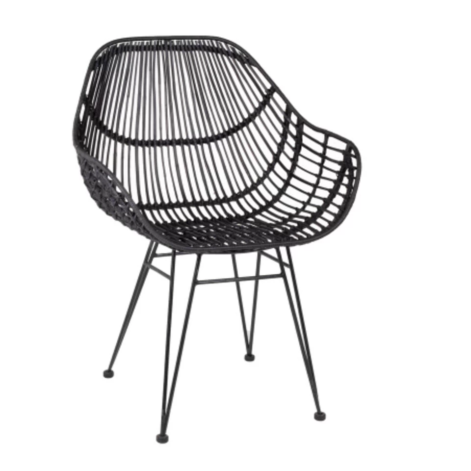Deze eetkamerstoel is een ware eyecatcher voor iedere woonruimte. Ondanks dat deze stoel de naam eetkamerstoel heeft gekregen staat deze stoel met retrolook ook heel mooi in een woon- of slaapkamer. Zet de stoel in de hoek van je kamer en leg er een schapenhuid of wollen kleed en een leuk kussen op en je hebt een heerlijk hoekje. Deze eetkamerstoel heeft een comfortabele zitkuip met armleggers. Tevens in de stoel gemaakt van rotan, dit geeft de stoel meteen een retro uitstraling. Maar niet alleen fans van de retrolook zullen deze stoel een aanwinst voor de woning vinden, ook in een modern interieur voelt deze stoel zich thuis. Dit komt door het onderstel van de stoel, de kleur zwart is een moderne kleur en past bij vele andere kleuren en stijlen. Zithoogte: 47cm Armleuninghoogte: 66cm