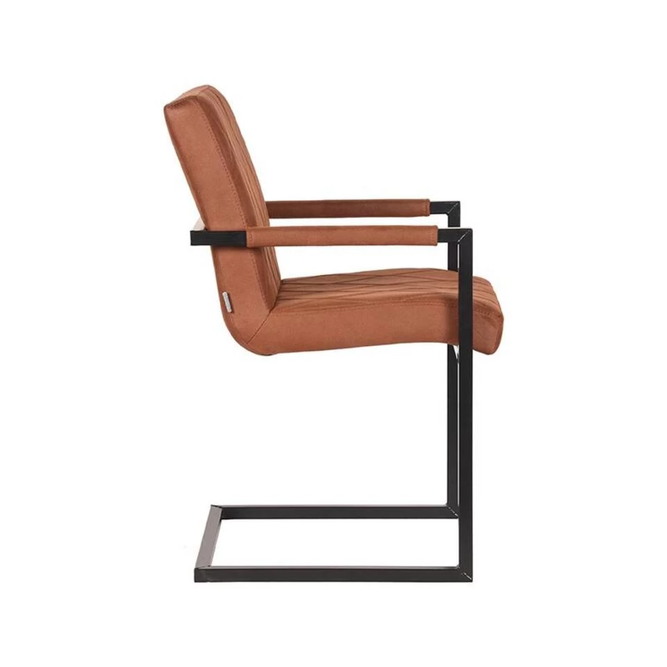 Het U-vormig zwart metalen onderstel, dat tevens doorloopt als armleuning, geeft de stoel een bijzonder elegante uitstraling. Als kers op de taart heeft de armleuning een fijn gestoffeerd armvlak.